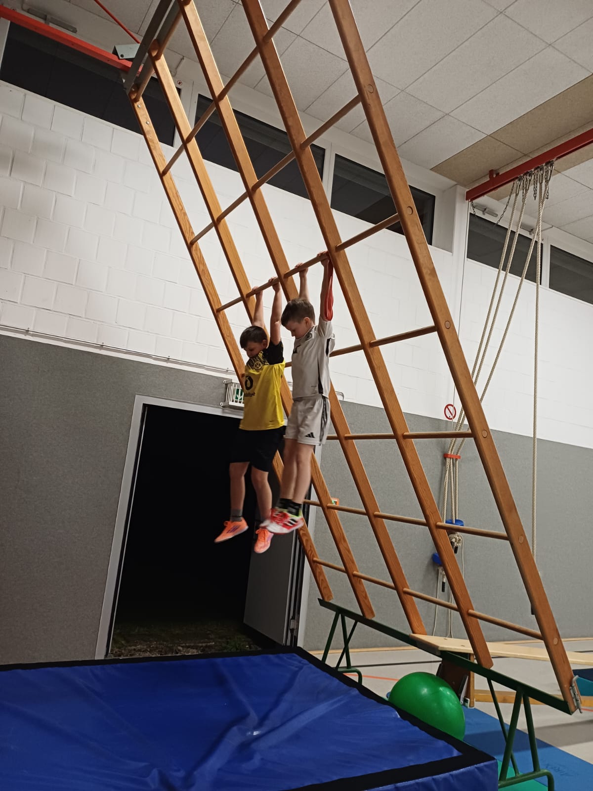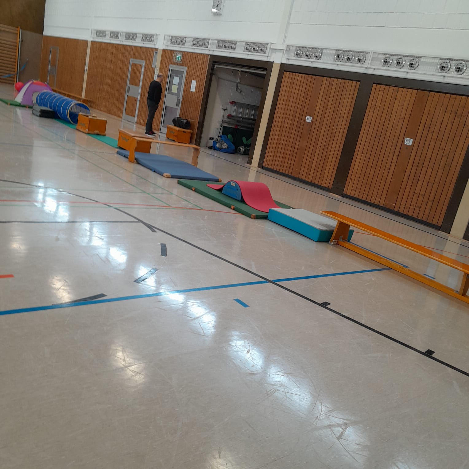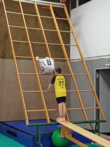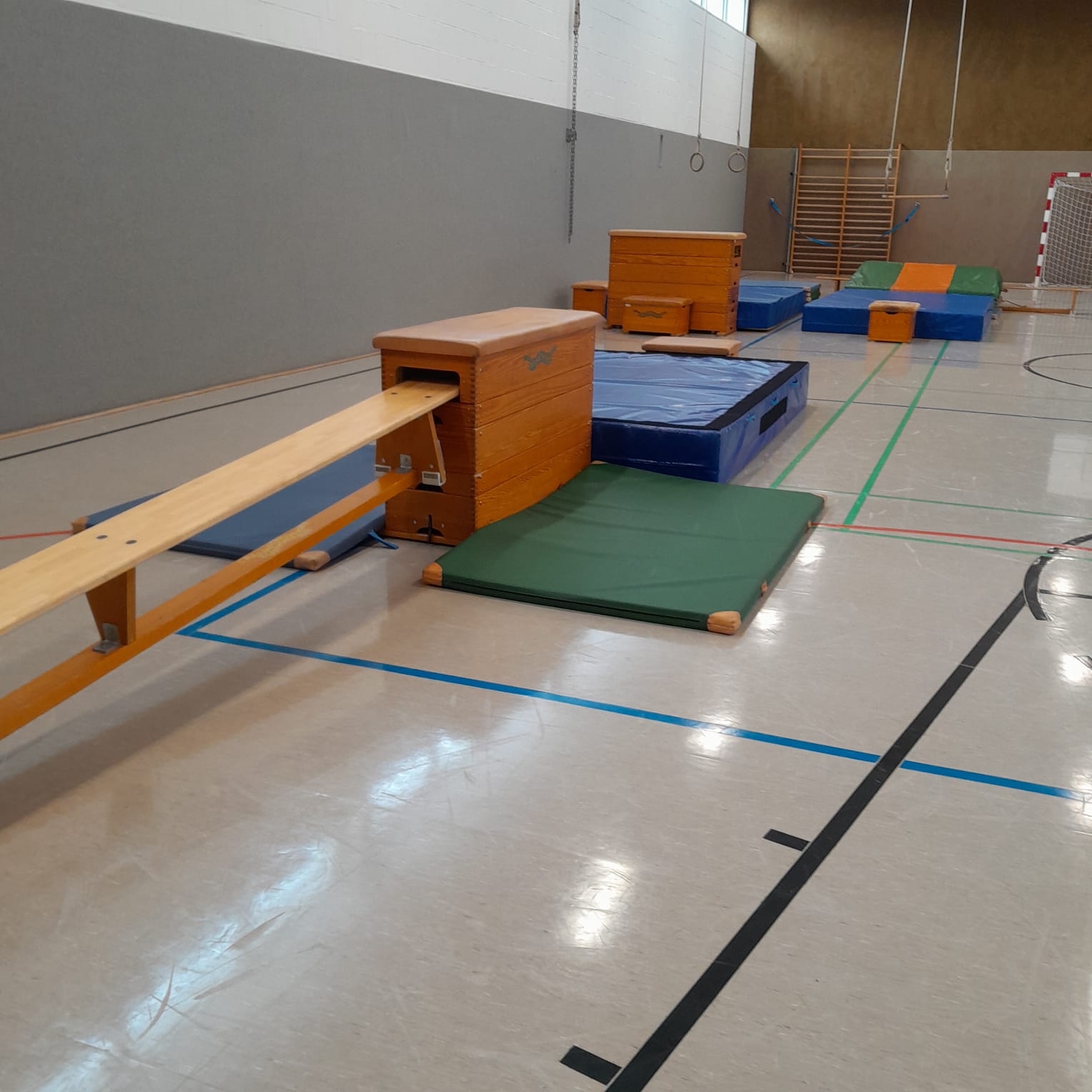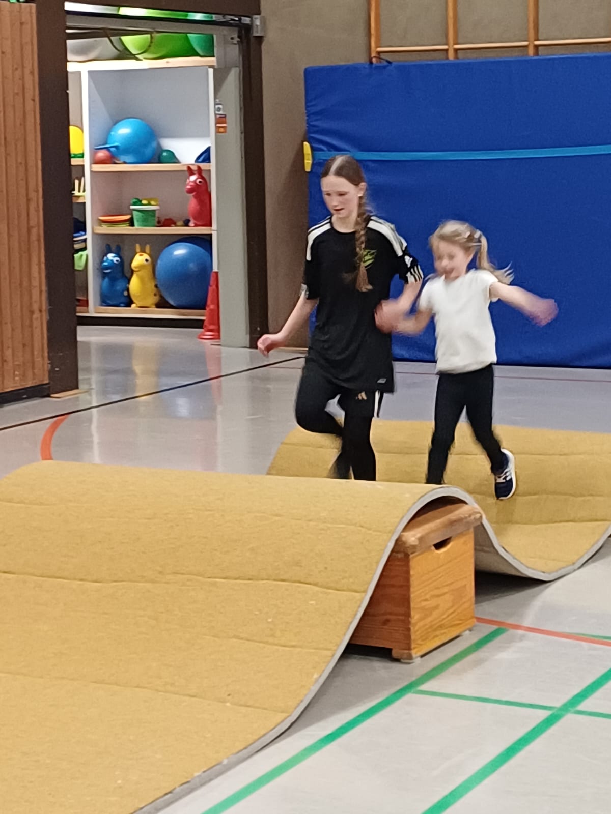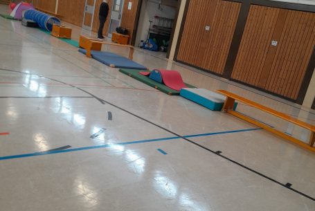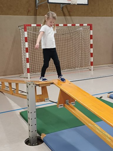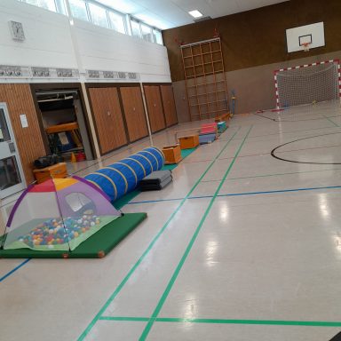 In der Sporthalle entdecken die Kinder abwechslungsreiche sportliche Aktivitäten. Dabei kommen klassische Hallensportgeräte wie Bälle, Matten, Kästen oder Reifen zum Einsatz, die zu Bewegung, Koordination und Kreativität anregen. Ziel ist es, Freude an Bewegung zu vermitteln und die motorischen Fähigkeiten der Kinder altersgerecht zu fördern.