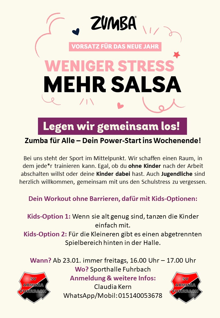 Ein besonderes Higlight ist unsere neue Zumba®-Gruppe für Kinder und Erwachsene. Hier verbinden wir Bewegung mit Musik und Tanz. Zu rhythmischen Klängen werden einfache Tanzschritte und Choreografien gelernt, die leicht umzusetzen sind und vor allem eines machen: Spaß!
